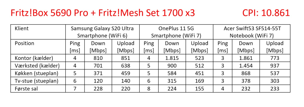 Den totale CPI-rating er faldet en anelse – fra 11.076 til 10.861, men WiFi-signalerne rækker mærkbart længere ud i krogene på alle tre etager.