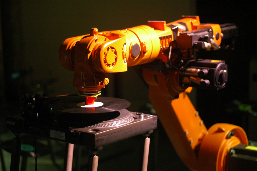 Hundrede heliumballoner som pixels i en grovkornet skærm, industrirobotter, der vendte vinylplader og en spiselig brugergrænseflade.