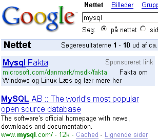 En søgning på Google har i et stykke tid ført til en annonce med overskriften "Mysql Fakta", hvorfra der linkes videre til Microsofts hjemmeside.