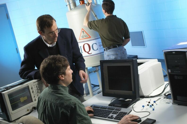 I laboratoriet eksperimenterer Raymond Laflamme og hans hold af forskere med forskellige molekyler, som kan tænkes at have de rigtige egenskaber til at fungere som et kvantebaseret computersystem.