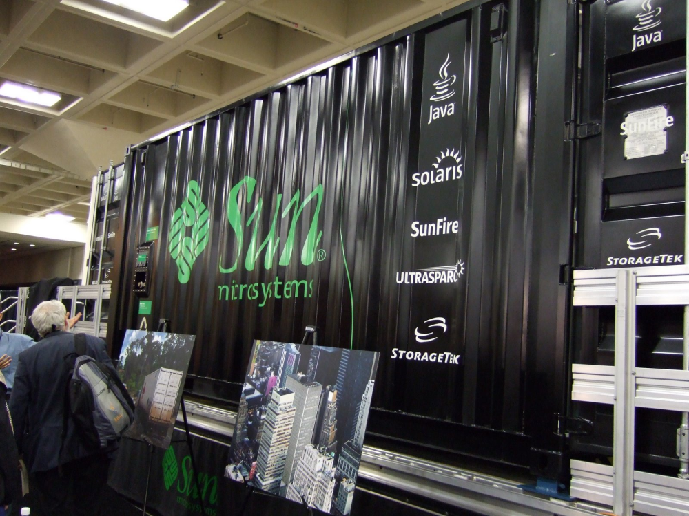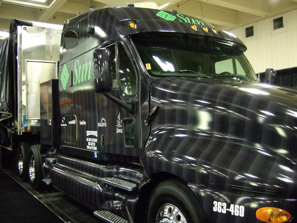 Den synligt stolte Sun-medarbejder, der viser rundt for det internationale pressekorps på JavaOne-udviklerkonferencen er synlig stolt over det massive datacenter, som i anledning af konferencen er placeret solidt på en amerikansk megatruck, som også huser en komplet dieselgenerator, der kan levere 200 kilowatt til drift og køling af det rackmonterede udstyr.