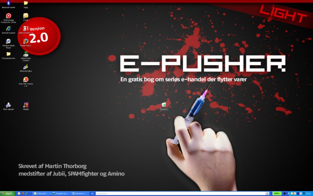 "Normalt har jeg et billede af mine børn, men jeg har lige fået en ny computer, og på den har jeg forsiden af anden version af min nye bog, e-pusher 2.0, for at holde fokus. Det er et lidt drabeligt billede, men det er egentlig meget cool.