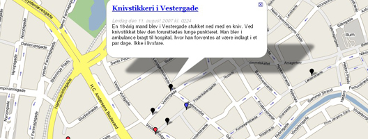 Indtil videre kan man sortere de enkelte kriminalitetstyper fra, så man kun får vist den type, man er interesseret i. Fra de enkelte knappenåle kan man komme direkte til politiets døgnrapport.