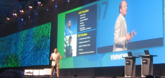 Herefter trådte han ned fra messecenterets store scene, og mens han vandrede imellem de tilhørende, forklarede han, hvordan virtualisering kan forandre bundlinjen i ethvert firma.