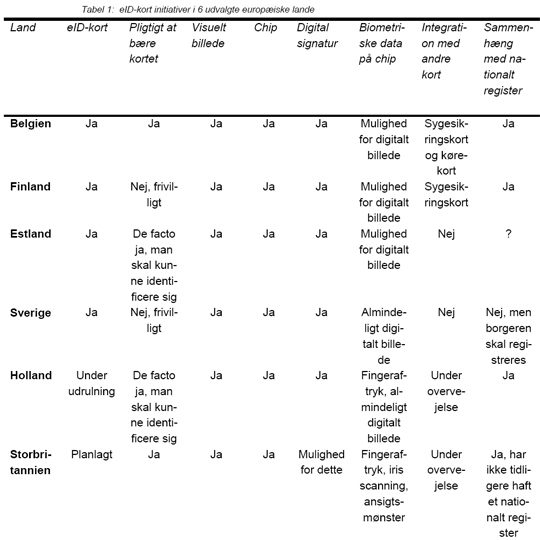 I tabellen herunder ses, hvilke initiativer, seks udvalgte europæiske lande har taget i forbindelse med borgerkort.