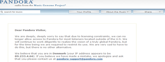 Mens andre lignende tjenester som LastFM har fortsat deres virksomhed, valgte Pandora at lukke for europæiske brugere, fordi man ikke kunne få en licens til at sende musik til brugere udenfor USA.