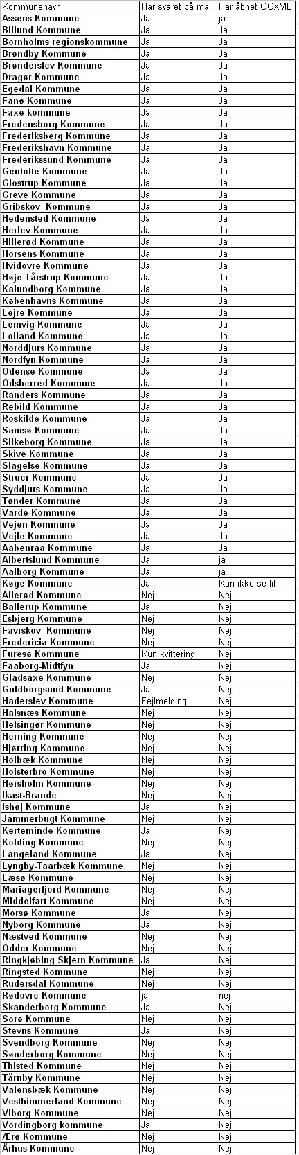Her er listen over kommunernes reaktioner på en mail vedhæftet en OOXML-fil.