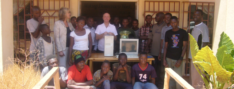 I midten ses formand for foreningen Fair Danmark, Bent Blindbæk, på besøg hos et af organisationens lokale samarbejdspartner National Initiative for Civic Educations (NICE) biblioteker i Mchinji, Malawi.