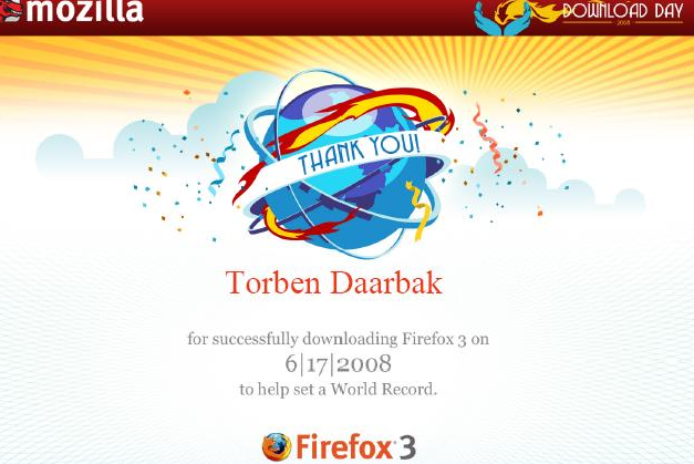 ”Tak fordi du hentede Firefox 3 og var med til at sætte en verdensrekord.”