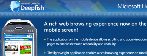 Computerworld News Service: Deepfish-browseren viste websider på telefoner med styresystemet Windows Mobile, præcist som de ser ud på en almindelig computer, og lod brugere zoome ind og ud på en side. Browseren fungerede sammen med Microsoft-servere, der leverede websiderne til telefonen.