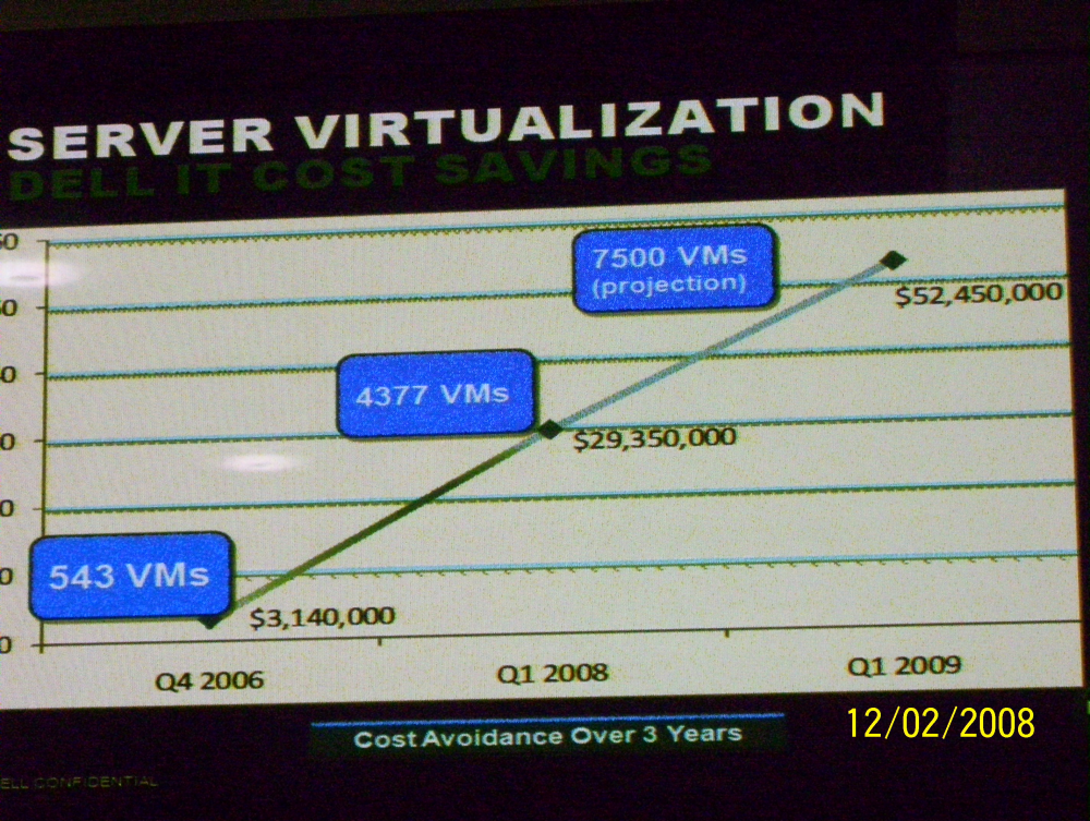 Ifølge Dells egne beregninger havde Dell sparet cirka 170 millioner kroner (29 millioner dollars) i første kvartal 2008 ved at konsolidere antallet af fysiske servere ved hjælp af virtualisering.