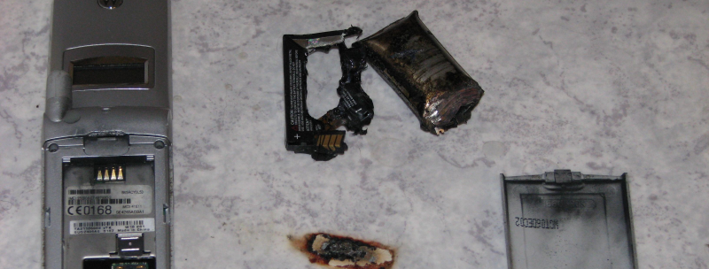 Midt i fredagshyggen eksploderede batteriet på Frida Hansens to år gamle Motorola T720 mobiltelefon, hvilket fik det til at flyve tre meter gennem køkkenet - ramme en væg - og ryge ned og brænde hul i linoleumsgulvet.