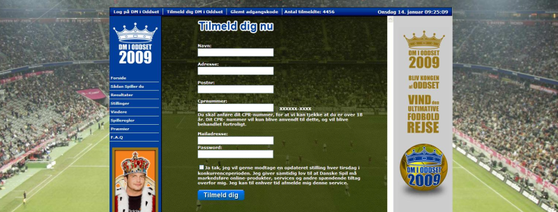 På tilmeldingssiden til 'DM i Oddset' skal man indtaste en række følsomme oplysninger for at få adgang til at være med.