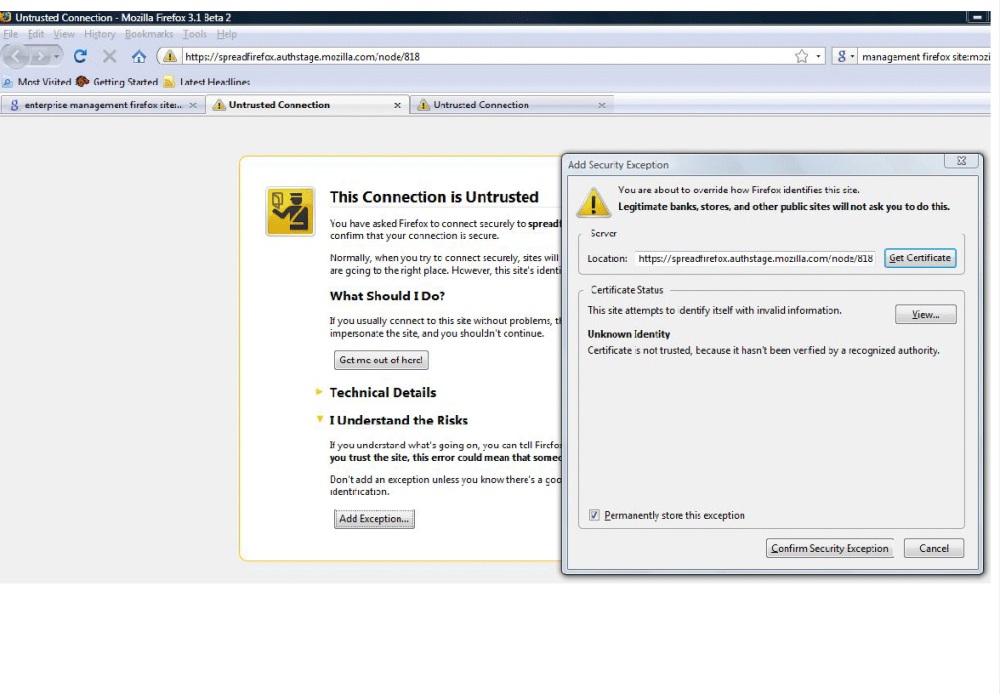 Brugere skal klikke og bekræfte flere gange for at komme til en webside med et dårligt eller utroværdigt certifikat, og de får mange muligheder for at gennemse og installere det pågældende certifikat.