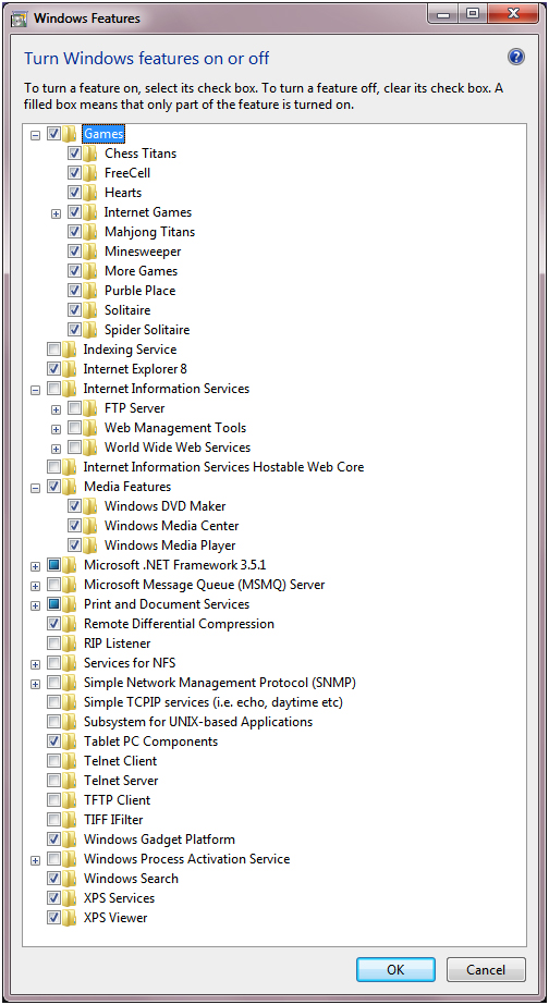 Windows Media Player, Windows Media Center, Windows DVD Maker, Windows Search, Fax og Scan - og altså Internet Explorer 8.