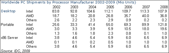 Tal fra analysehuset IDC (se tabel næste side) viser, at Intel i 2008 solgte 107,9 millioner processorer på verdensplan til stationære computere og 121,8 millioner til bærbare.