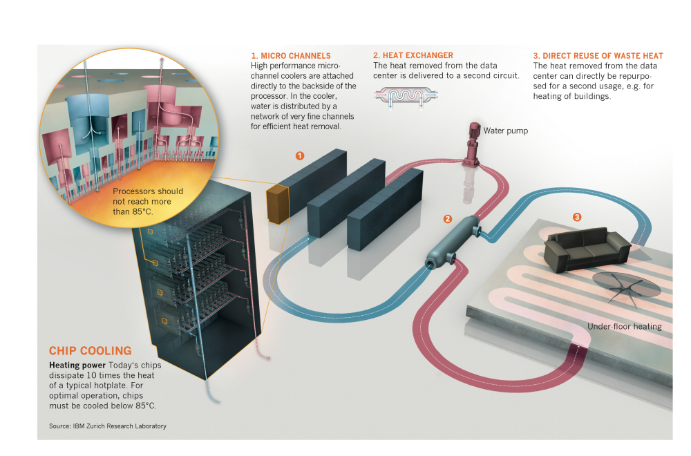 Når IBM's schweiziske forskningsafdeling ved Zürich-søen til næste år tager supercomputeren Aquasar i brug, vil maskinen, der kan levere op til 10 teraflops, nemlig som den første nogensinde blive nedkølet af 60 grader varmt vand.