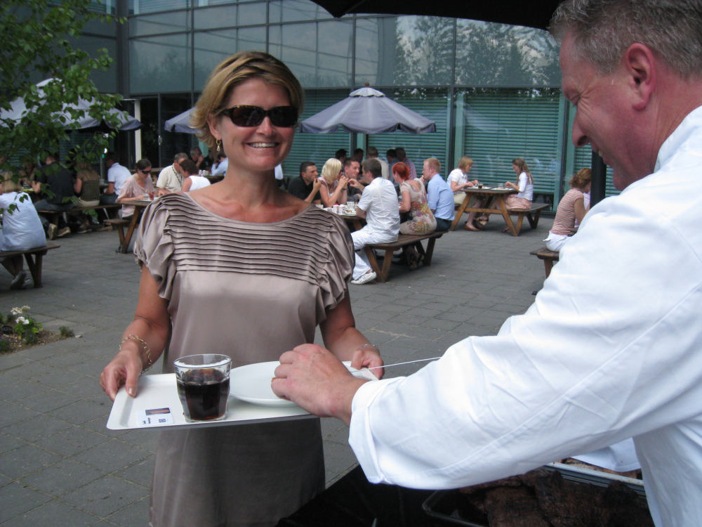 Vi har et stort ude-område, hvor vi kan sidde i solen, og i sommerperioden sætter de grill op. Der er tre kokke fra ISS Catering, og engang imellem laver de også vaffelis til os. De gør meget ud af det."