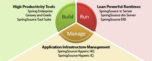 SpringSource har dog ambitioner om at dække hele livscyklussen for en applikation; fra udvikling over udrulning til produktion og vedligehold - eller "build-run-manage", som SpringSource kalder det.