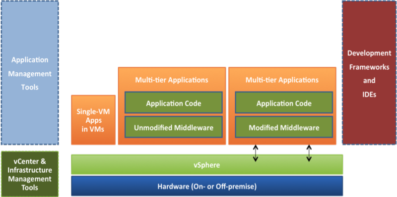 VMwares hypervisor-teknologi ligger mellem hardwaren og styresystemerne, mens SpringSources software ligger længere oppe; ovenpå Java-platformen, der hvor applikationerne skrives