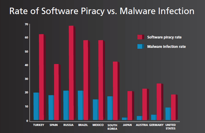 BSA bygger blandt andet sine konklusioner på, at der i de lande, hvor pirat-problemet er størst, ofte også er ekstra store problemer med malware.