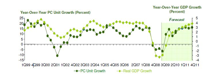 "Der er en stærk relation mellem antallet af solgte pc'er og udviklingen i de nationale BNP (Bruttonationalprodukter, red.)," siger Semmy Levitt og viser en oversigt over den udvikling som støtte for sin påstand.