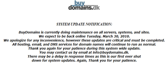 Hosting-udbyderens egen hjemmeside er lukket ned indtil tirsdag 30. marts på grund af vedligeholdelse (se skærmdump i faktabox her over).