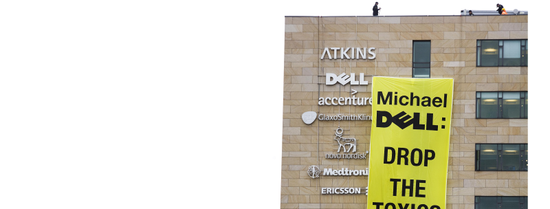 "Michael Dell - drop the toxics," står der på det banner, som otte aktivister fra Greenpeace her til eftermiddag har rullet udover Dells hovedkvarter i Danmark.