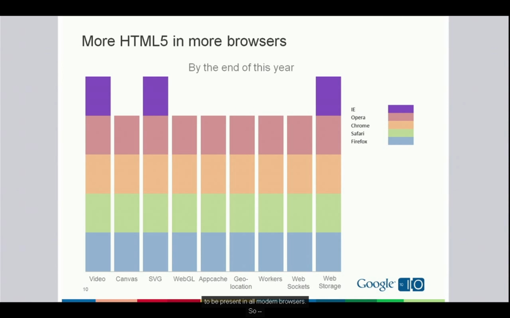 "Hvor forventer vi så at være i slutningen af i år?" spurgte Sundar Pichai og viste en slide, hvor Opera, Chrome, Safari og Firefox havde fuld understøttelse af de ni HTML5-API'er. Internet Explorer havde kun understøttelse af tre.