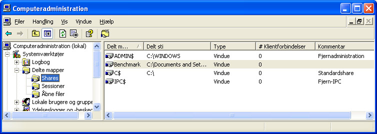 Har du brug for nemt at kunne administrere pc’ens delte mapper, kan det gøres på følgende måde. Gå til Start, Kør, Kontrolpanel, Administration, Computeradministration. Under punktet Delte mapper klikker du på Shares for at se, hvilke mapper på pc’en, der er delt.
