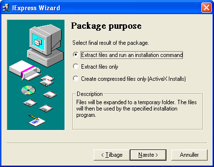 Gå til Start, Kør, skriv iexpress og tryk på Enter. Det starter IExpress, hvor man kan oprette en selvudpakkende installationsfil komplet med filer, licensbetingelser og hvad der ellers hører sig til.