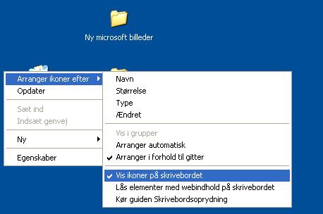 Højreklik på skrivebordet og vælg Arranger ikoner efter og find punktet Vis ikoner på skrivebordet. Ved at klikke på dette punkt fjerner man fluebenet, og alle ikonerne gemmes væk. De kan til enhver tid hentes frem igen ved at sætte fluebenet tilbage.