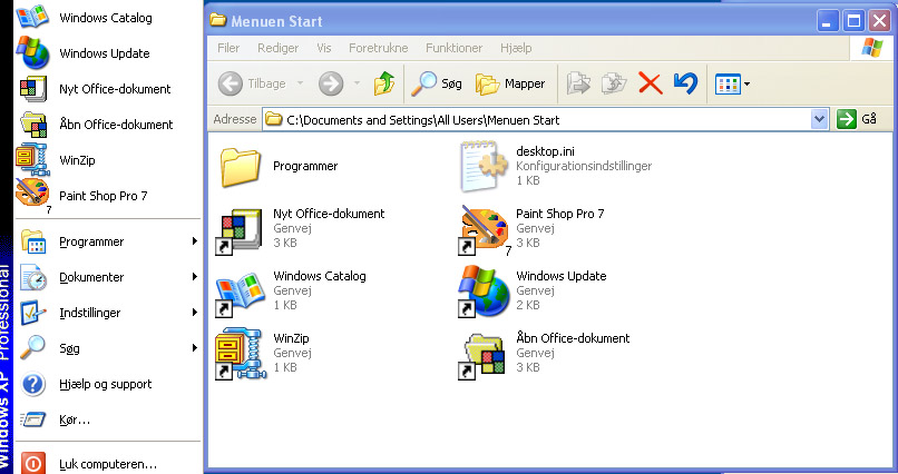 Er du utilfreds med de programmer, som ligger i Start menuen, kan du selv fjerne eller tilføje nye programmer. Højreklik på Start og vælg Åbn mappen Alle brugere. Det vil åbne et vindue med de genveje, som ligger i Start menuen, og så kan du fjerne, flytte rundt og tilføje, som du har lyst.