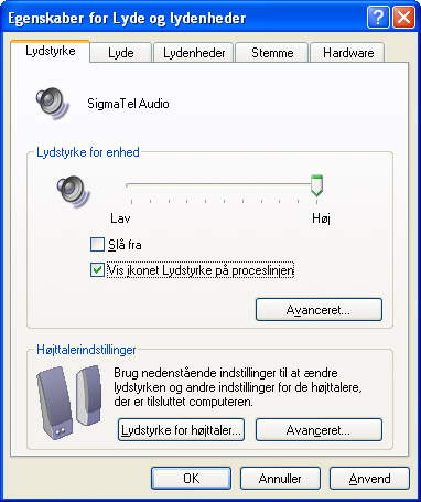 Gå til Start, Kontrolpanel, Lyde og lydenheder. Under fanebladet Lydstyrke sætter du flueben i punktet Vis ikonet Lydstyrke på proceslinjen.