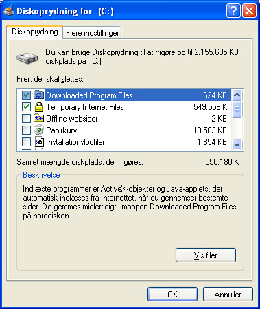 Ved at trykke på Diskoprydning starter du en guide, der undersøger hvor meget plads, der kan frigøres. Når guiden er færdig, får du mulighed for at vælge, hvilke af de foreslåede filer, du vil have slettet.