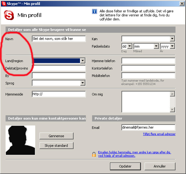 Gå op under "filer" og klik på "Personlig profil". I profilen har du mulighed for at fjerne vitale personoplysninger. Blandt andet kan du rulle ned og vælge ikke at vise, at du er fra Danmark. Også navn og epost-adresse kan desuden fjernes.