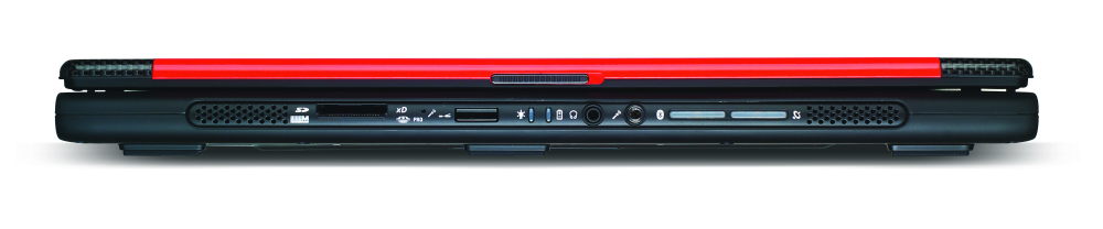 På fronten finder man små højttalere, knapper til aktivering af Bluetooth og trådløst netværk, infrarød port, mikrofonindgang og udgang til høretelefoner. Her er også en indbygget læser til alle de mest populære typer hukommelseskort, dog undtagen de store CompactFlash kort.