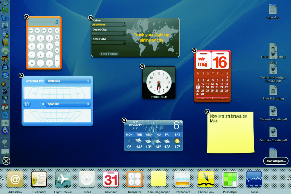 Dashboard har ikke nogen funktion i sig selv, man skal fylde den med indhold. Her er der et bredt udvalg af små programmer at vælge mellem. Apple kalder dem widgets.