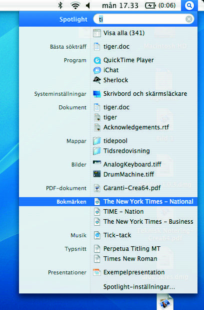 Søgefunktionen Spotlight er altid til stede i øverste højre hjørne. Søgemotoren indekserer harddisken, og ved søgning kommer resultaterne umiddelbart efter, at der trykkes på knappen.