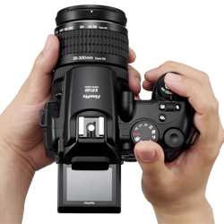 LCD skærmen kan foldes ud og tiltes op og ned på samme måde, som det kendes fra Konica Minoltas største modeller. Vi kunne godt savne en rigtig svingbar LCD skærm, som Canon laver dem.
