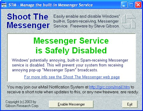 Desværre kan Messenger misbruges til at sende spam til pc’en. Desuden optager tjenesten værdifulde systemressourcer. Men man kan nemt stoppe tjenesten ved at hente gratisprogrammet Shoot The Messenger, som er skrevet af Steve Gibson.