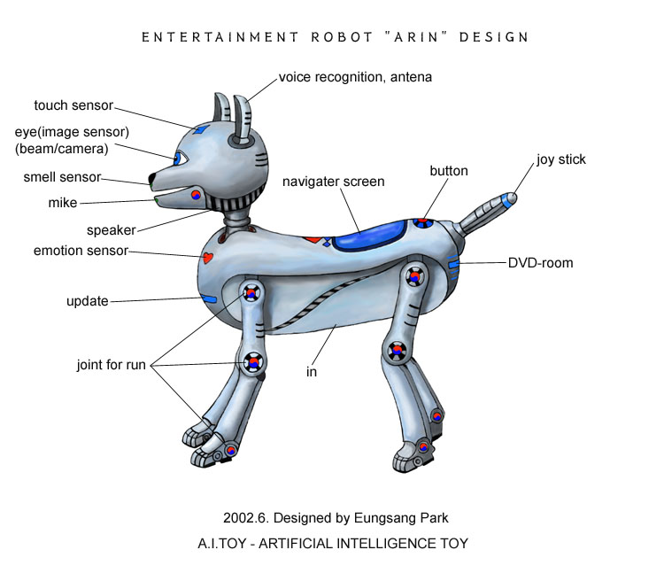 Hans robothund hedder Jindo og skal være langt mere avanceret end Aibo, skriver Newlaunches.com. Lighedstrækkene med en rigtig hund skal være større, og dens krop og ben er designet, så den kan løbe.