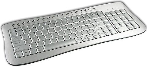 Tastaturet er sølvfarvet og sort og har en pukkel midt på oversiden. På puklen finder vi et sæt medieknapper plus et stort hjul til regulering af lydstyrken. Hjulet giver en skøn scratch-lyd, som dog ikke kan bruges til scratching!