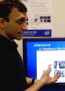 SANTA CLARA, CALIFORNIEN – Rahul Sukthankar har et begejstret smil på læben. Han står ved siden af en computer, der kører programmet Diamond SnapFind. Normalt arbejder han i Intel Research i Pittsburgh, men i dag er han taget til Intels hovedafdeling i Santa Clara for at deltage i konferencen Research at Intel.