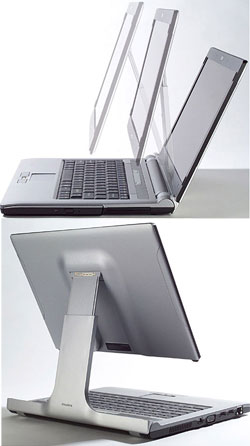 Det ergonomiske problem forsøger firmaet Dialogue fra Taiwan at løse med sin nye bærbare Flybook VM, som har en justerbar 12,1 tommer skærm på 1.280 gange 768 pixels.