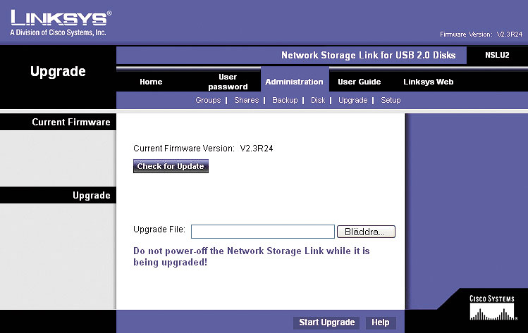 Først og fremmest skal du tilslutte en USB-harddisk til din Linksys Nslu2-enhed (disk 1-tilslutningen) og installere den, så du kommer frem til indstillingerne via webgrænsefladen.