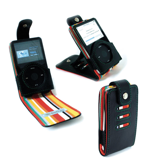 Læderetuiet The Versa fra Das Blau findes i otte moderigtige farver, og foret er i mere eller mindre psykedeliske mønstre. Passer til Ipod Video. Flip-designet er praktisk bælteclipen kan knappes fast til flappen, så etuiet fungerer som holder.