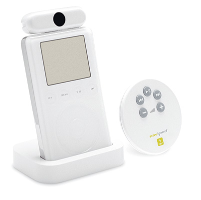 Fjernbetjeningen Ten Navipod har smukke runde former. For at komme i kontakt med iPod'en skal der sættes en modtager på iPod'en. Modtageren hører sammen med et ganske grimt metalstativ, men det gør måske ikke så meget bare det virker.
