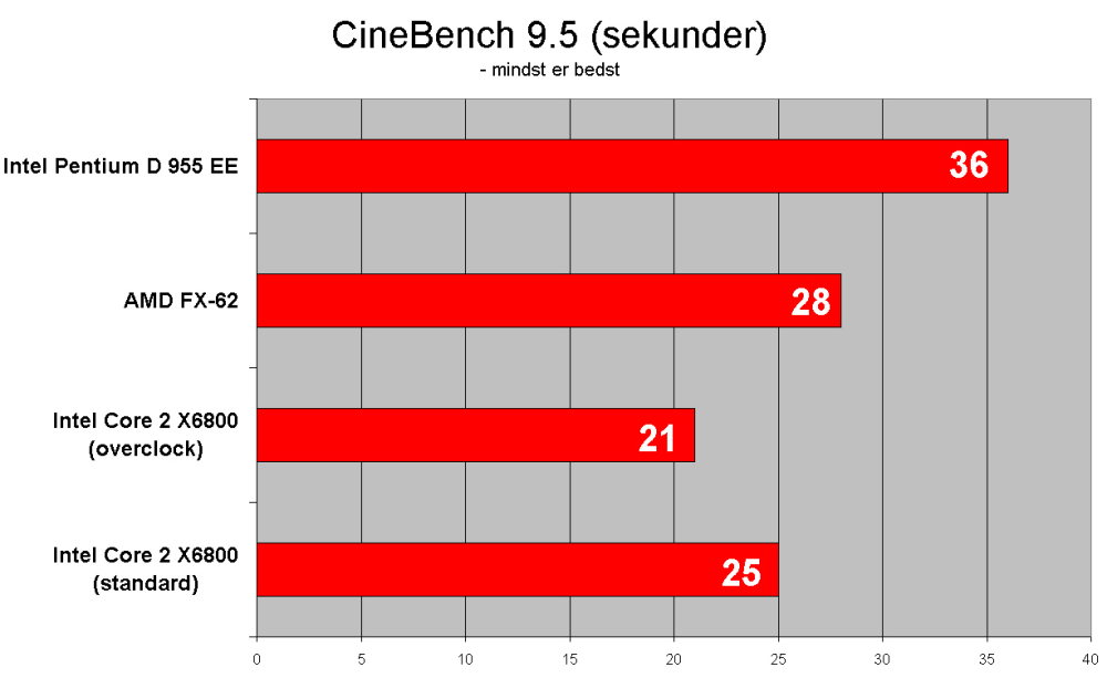 Og her er det helt tydeligt, at der er sket en mindre revolution hos Intel. Hvor Pentium D 955 klarende multiprocessor regnetesten CineBench 9.5 på 36 sekunder, kan Core 2 Duo X6800 gennemregne nøjagtig samme opgave på 21 sekunder. En forbedring på små 42 procent. Imponerende.