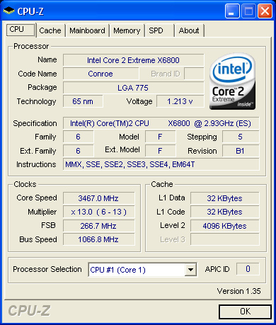 I modsætning til de seneste generationer af Pentium 4, hvor der knapt kunne pines lidt ekstra megahertz ud af 3,8 GHz versionen, så er der noget højre til loftet med Core 2 Duo X6800. Ved blot at ændre multiplieren på bundkortet gik vi fra 2,93 GHz til 3,46 GHz og har kørt stabilt med denne opsætning i flere uger. Det giver håb for yderligere og hurtigere processorer i serien.